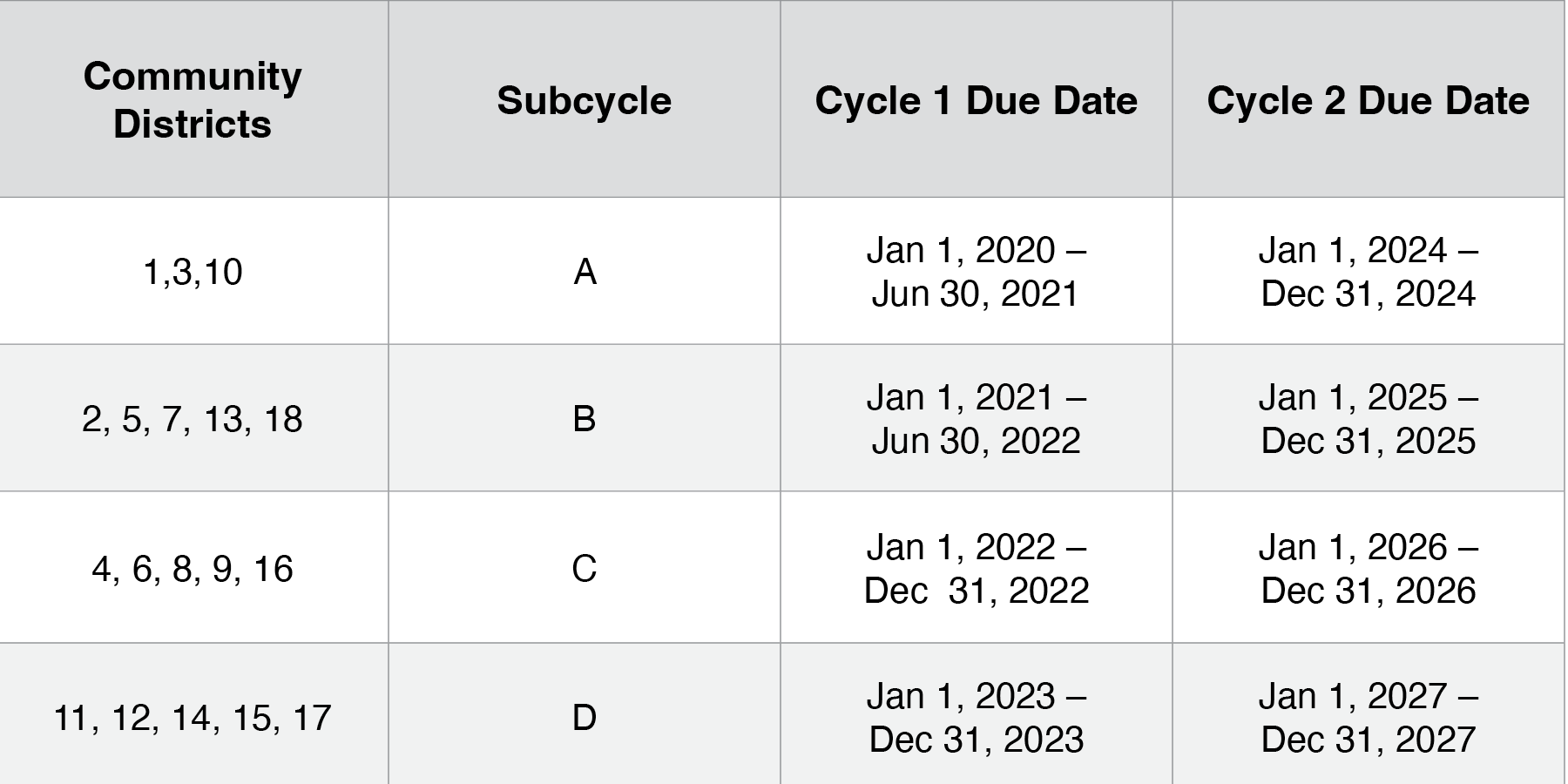 Here’s a breakdown of the inspection and the certification due dates by community district: